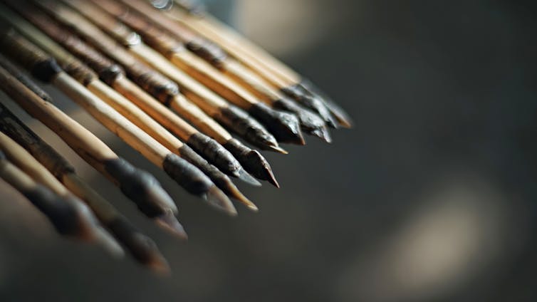 To test the ballistic properties of the stone points found in the Mandrin cave, modern duplicates were created and hafted on to shafts, as they may have been 54,000 years ago. Laure Metz, Ludovic Slimak, CC BY-SA